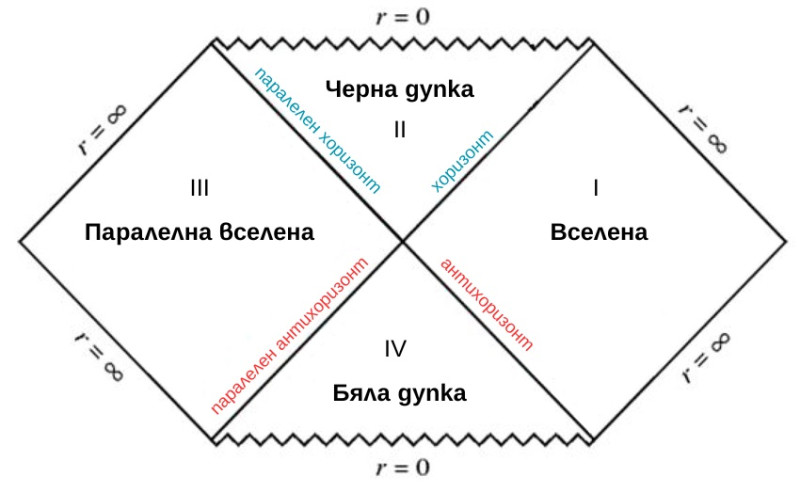 Фиг. 7. Диаграмата на Пенроуз за невъртяща се шварцшилдова черна дупка, даваща определеност на ставащото в нашата и другата вселена.