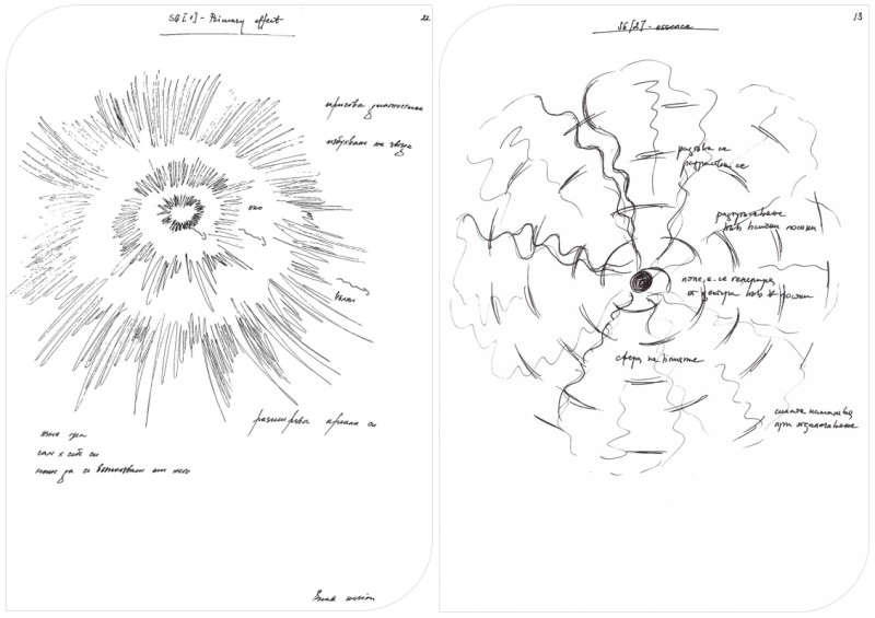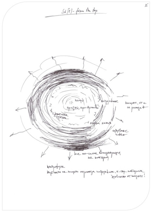 Като финален щрих към тази фаза от проекта, представяме и по-детайлна скица (Фиг. 28) на едно от завихрянията, детектирано в центъра на планетата. Вербалните данни на вюъра насочват към космогоничен процес – раждането на материя от нищото, в която е заложено усещане за първичност, енергия и разгръщане. Вюърът разказва: