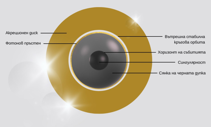 В центъра е сингулярността или самата черна дупка – мястото, за което днешната физика не знае почти нищо, и което не може да бъде видяно от външен наблюдател. Неговата външна граница се нарича „граница на Шварцшилд“ и е известна още като хоризонт на събитията. Разстоянието от центъра на черната дупка до хоризонта на събитията се нарича „радиус на Шварцшилд“ и се използва в метриката на черните дупки за почти всичко. Хоризонтът на събитията определя точката, отвъд която нищо, дори светлината, не може да избяга. Него също не можем да видим директно, защото светлината там бива поглъщана. Около сингулярността всъщност има зона, наречена „сянка на черната дупка“, която е 2,6 пъти радиуса на Шварцшилд по-голяма от самата черна дупка или хоризонта на събитията. Сянката е оградена от тънък фотонов пръстен, който виждаме – това е светлина, която може да орбитира толкова близо, защото няма собствена маса.