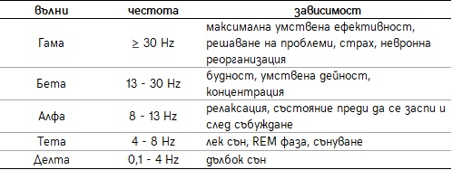 Друг интересен аспект откриваме във връзката между мозъчната активност и честотите. Вижте отново таблицата за различните честоти и какво означават те.