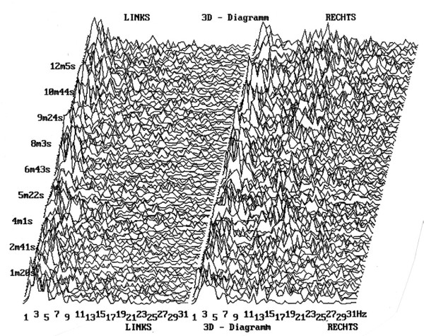 Нека да разгледаме резултатите. Диаграмата е структурирана в две части, всяка от които представлява едно полукълбо на мозъка. Те са маркирани с „дясно“ и „ляво“. Оста Х показва импулсната честота на мозъка, главно между делта и гама, които са важни за ежедневието. Оста У отчита изминалото време. Проектната ос Z показва характеристиките на отчитането. Този метод може да бъде интерпретиран лесно от всеки лаик.