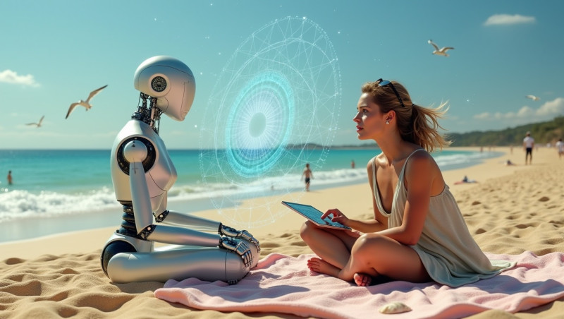 Август си отива, но слънцето още гали кожата, морето шепне сладки обещания, и дори ние, неуморните търсачи на истини, си взехме почивка! Разположени удобно на шезлонга, с вълни в ушите и звезди в мислите, решихме да си побъбрим с най-забавния изкуствен интелект в наши дни 😉 Защо да си говориш за времето с комшията по чадър, като можеш да обсъждаш тайните на Вселената с ИИ, при това по бански? 😀