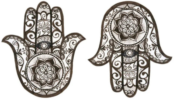 Една от безкрайно многото вариации за изобразяване на хамса. Счита се, че сочеща нагоре ръката закриля от зли сили, а надолу означава благословия.