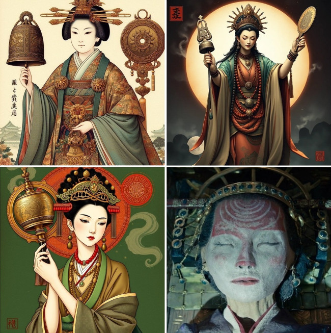 Бел. RV Insights: Изображенията на Химико в японските популярни медии представят един от следните три характерни архетипа: Химико е мъдра, стара владетелка; Химико е симпатична и енергична шаманка; или Химико е съблазнителна магьосница. Тя се свързва с няколко ритуални предмета, включително дотаку – две големи бронзови камбани, използвани ритуално в края на периода Яйои, както и с клонката сакаки и китайските бронзови огледала. В „Уей джи” шаманизмът на Химико е описан като гидао или японско кидо, вид даоистка народна религия. В тази връзка Химико понякога се асоциира негативно с черна магия или демони. Управлявайки в преходния период между епохите Яйои и Кофун, изображенията на Химико често я показват облечена в дрехи, произхождащи от различни периоди, често въплъщаващи мъжки елементи. Кралица по време на късния Яйой, Химико вероятно е носила едноцветна косоде с широки ръкави под жилетка и пояс. Тя също така често е изобразявана с мъниста магатама и диадема. Никой обаче не може да бъде сигурен какво е носила Химико. За сметка на това нейният образ и архетип присъстват в редица филми и видеоигри, като персонажът ѝ заема централно място в игралния филм от 2018 г. „Tomb Rider: Първа мисия”. Съпоставка на трите основни архетипа на Химико, генерирани чрез ИИ, и визията ѝ от филма може да видите по-долу.