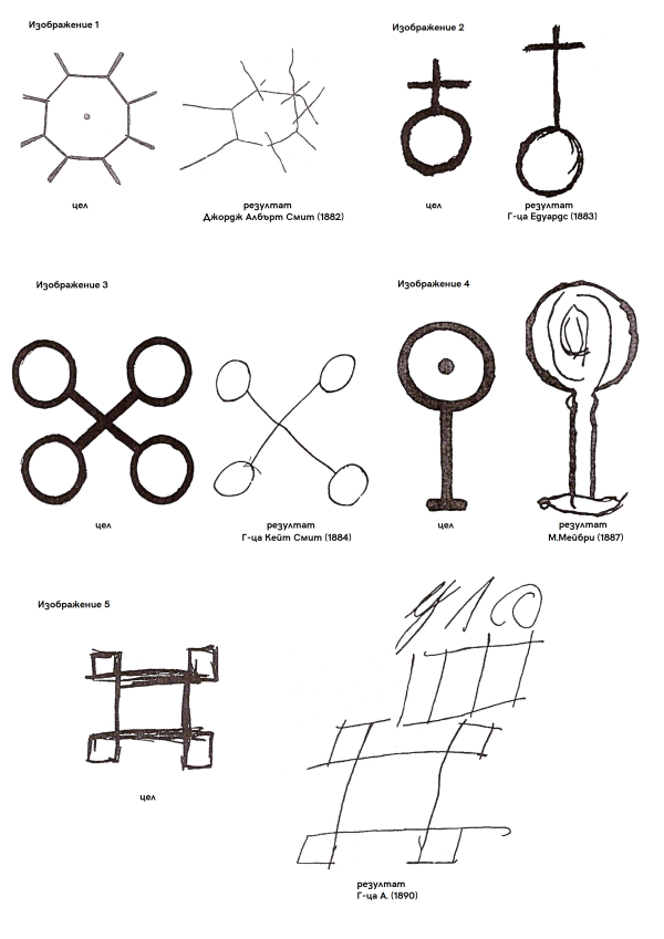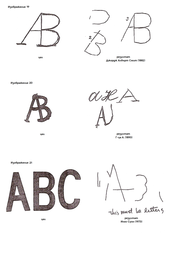 Ще забележите, че Смит е трябвало да направи повече от един опит, за да реализира връзката между „A“ и „B“, но пък накрая го прави перфектно. Няколко години по-късно следващ субект получава почти идентична цел (изображение 20). Тук „B“ не успява да се визуализира и опитите също са повече. Много години по-късно самият Инго Суон получава подобна цел, работейки с независима група, заинтересувана от развитието на този тип психически постижения. Той споделя, че не е очаквал пликът със запечатаната цел да съдържа букви. Ясно си спомня, че е имал трудности с целта, но когато разпознава „А“, заключава, че целта трябва да представлява букви. Ще забележите, че все пак не ги е визуализирал всичките.