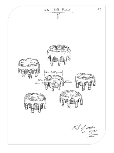 Тези колони се явяват подземната част на мащабна конструкция, чиято надземна част завършва с пирамидална конструкция.