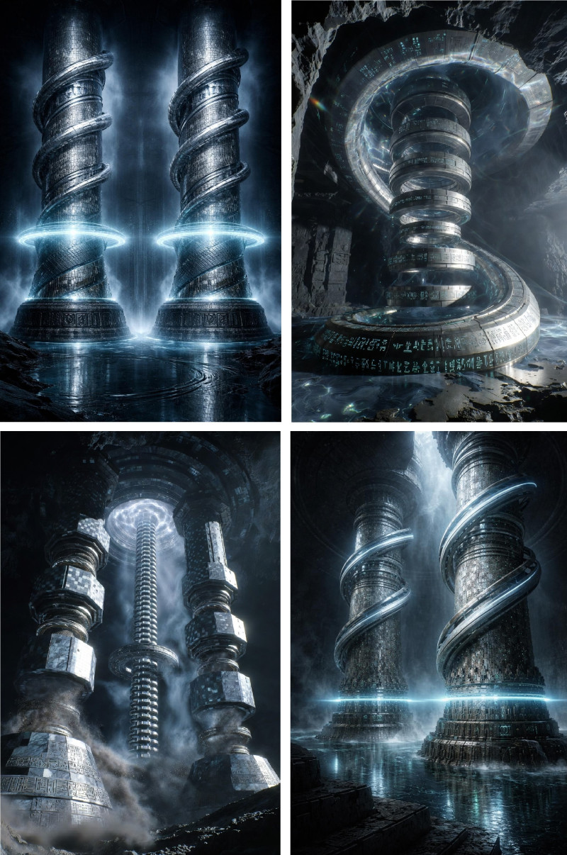 Цилиндричните конструкции са кухи и са изградени от метална сплав (извлечени са данни за титан и кадмий) в комбинация от камък (мрамори с кристални жилки) и органични полимери. Самите отделни изграждащи сегменти имат цилиндрична и осмоъгълна форма. От външната страна колоните са покрити с малки квадратни плочки.