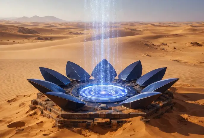Ако можехте да се върнете назад във времето, за да наблюдавате работата на устройството в реална среда, вероятно първо щяхте да видите огромно, почти безкрайно равно пространство – древна земна твърд, където времето е спряло. В една-единствена точка от тази пустинна безкрайност земята се разтваря леко, сякаш някой отлепя тънък пласт от реалността. Там, полузаровено, се издига древно устройство – не машина в съвременния смисъл, а нещо по-органично и по-старо. Горната му част е отвор с осмоъгълна форма – идеално симетричен, остър, почти математически чист. Около този отвор се движат лъскави сини плоскости, които се отварят и затварят като живи клепачи. В центъра се оформя басейн от синьо-виолетова енергия – гъста, пулсираща, жива. Оттам нагоре се изстрелват снопове лъчи, които приличат на семена, посявани в небето.