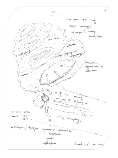 Поне на три пъти във височината се усеща преминаване на нещо през структурата – вода, наноси, лава, газ. При преминаването се осъществява процес вътре в съответната част на съображението, свързан с рафиниране, преработка и извличане. Целта е да се „отведе нагоре“.