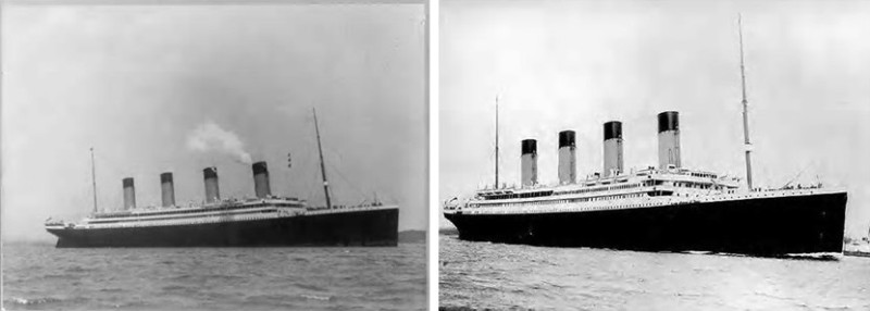 Преди да преминем към резултатите от RV изследването, ще засегнем накратко още няколко слабо известни факта. Много хора не знаят, че заедно с „Титаник“, компанията White Star Line построява още два кораба – „Гигантик“ (по-късно преименуван на „Британик“) и „Олимпик“, като и трите са почти идентични. Двата кораба „рамо до рамо“ можете да видите на автентична снимка3 от строителството им в Белфаст.